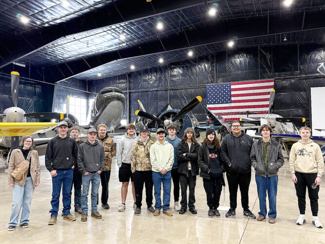 Submitted Photo Rugby High School junior Hannah Lemer, left, and senior English Language Arts students visited the Dakota Territory Air Museum in Minot March 11. The students have been studying nonfiction literature and recently finished reading “Unbroken” and “Night.” The air museum tour brought their lessons to life by seeing real warbirds. The students said it is one of the best field trips they have been on, Lemer said.