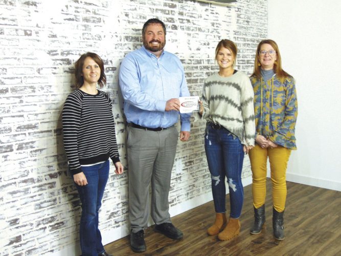 Sue Sitter/PCT Rugby Chamber of Commerce board members Tricia Jundt, left, and Josh Mattson present 106B Images owner Bailey Nelson with a Chamber of Commerce emblem. Chamber Executive Director Laurie Odden, far right, also welcomed Nelson.