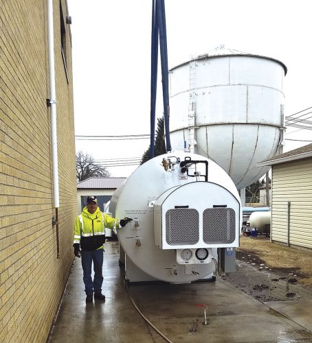 Submitted Photo Greg Boucher, manager of the Rugby water treatment plant, stands near a new carbon dioxide tank delivered to the facility March 9. The new tank will replace the city’s failing CO2 tank, which is more than 50 years old. The tank was purchased from Georgia firm TomCo, who submitted a winning bid of $97,802 plus installation costs to the city. The CO2 tank “lowers the pH in the water,” Boucher explained. “You’ve got to have CO2 to make drinkable water for Rugby.